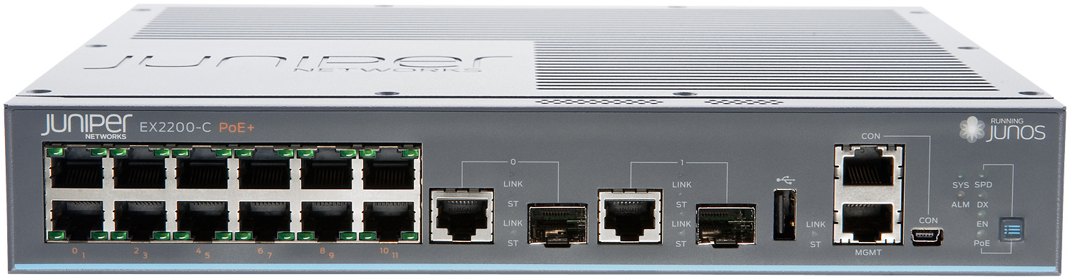 EX2200-C-12P-2G is an Ethernet switch with 12 10/100/1000BASE-T ports with PoE+ and two dual-purpose (10/100/1000BASE-T or SFP) uplink ports.