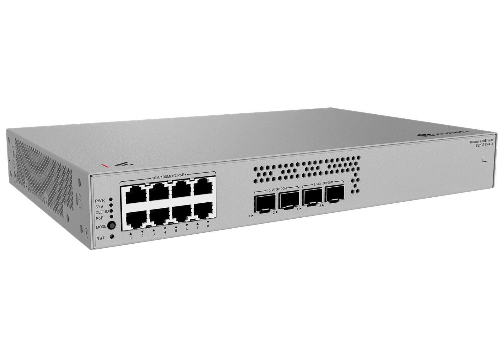S220S-8P4JX - 8x 1GE RJ45, PoE+ 128W, uplink 2x 10 GE SFP+, 2x 2.5GE SFP, zasilacz AC, niezarządzalny, Huawei eKitEngine S220S Switch