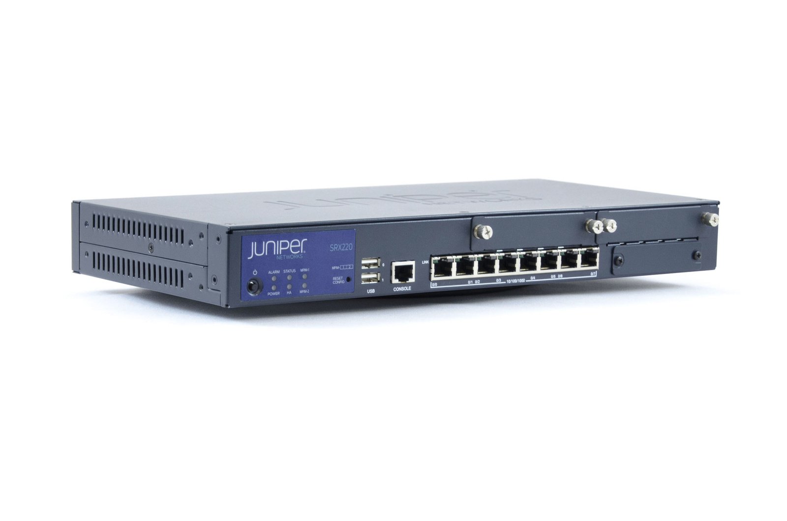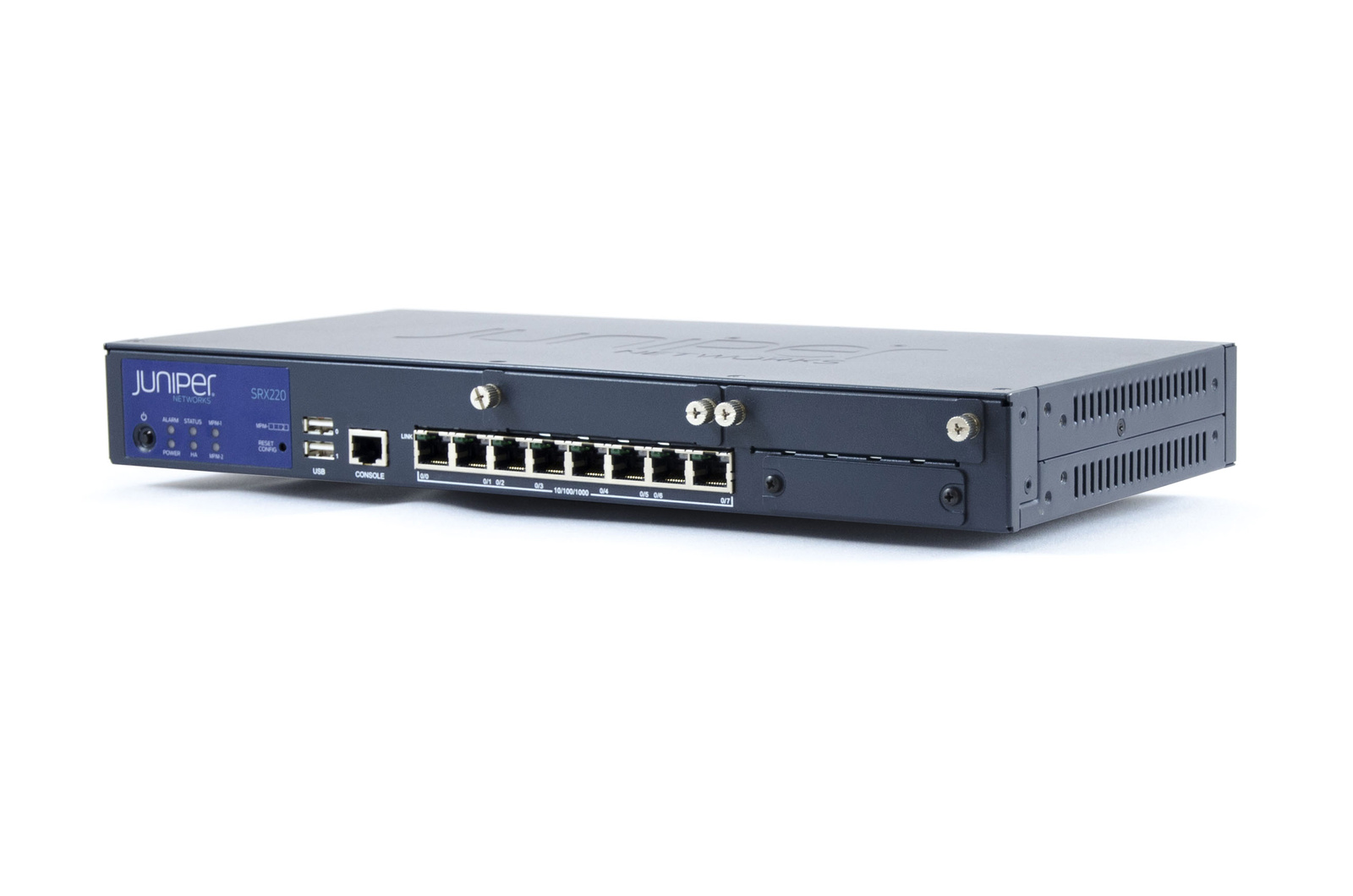 SRX220H2 - SRX services gateway 220 with 8 x GE ports, 2xmini-PIM slots, and high memory (2GB RAM, 2GB FLASH). External power supply and cord included.