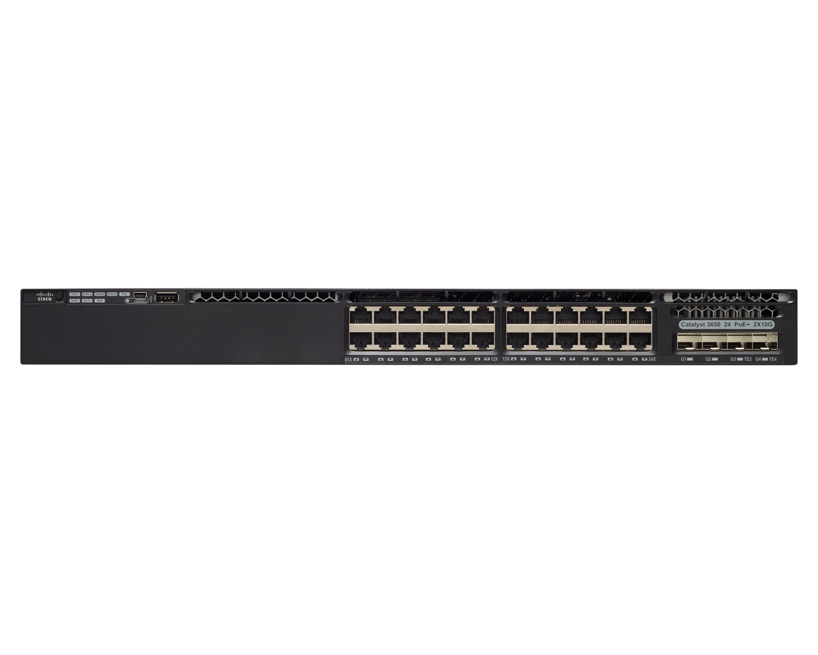 • Switch Cisco Catalyst 3650 Optional Stacking 24 10/100/1000 Ethernet PoE+ and 2x10G Uplink ports, with fixed 640WAC power supply, 1 RU, LAN Base